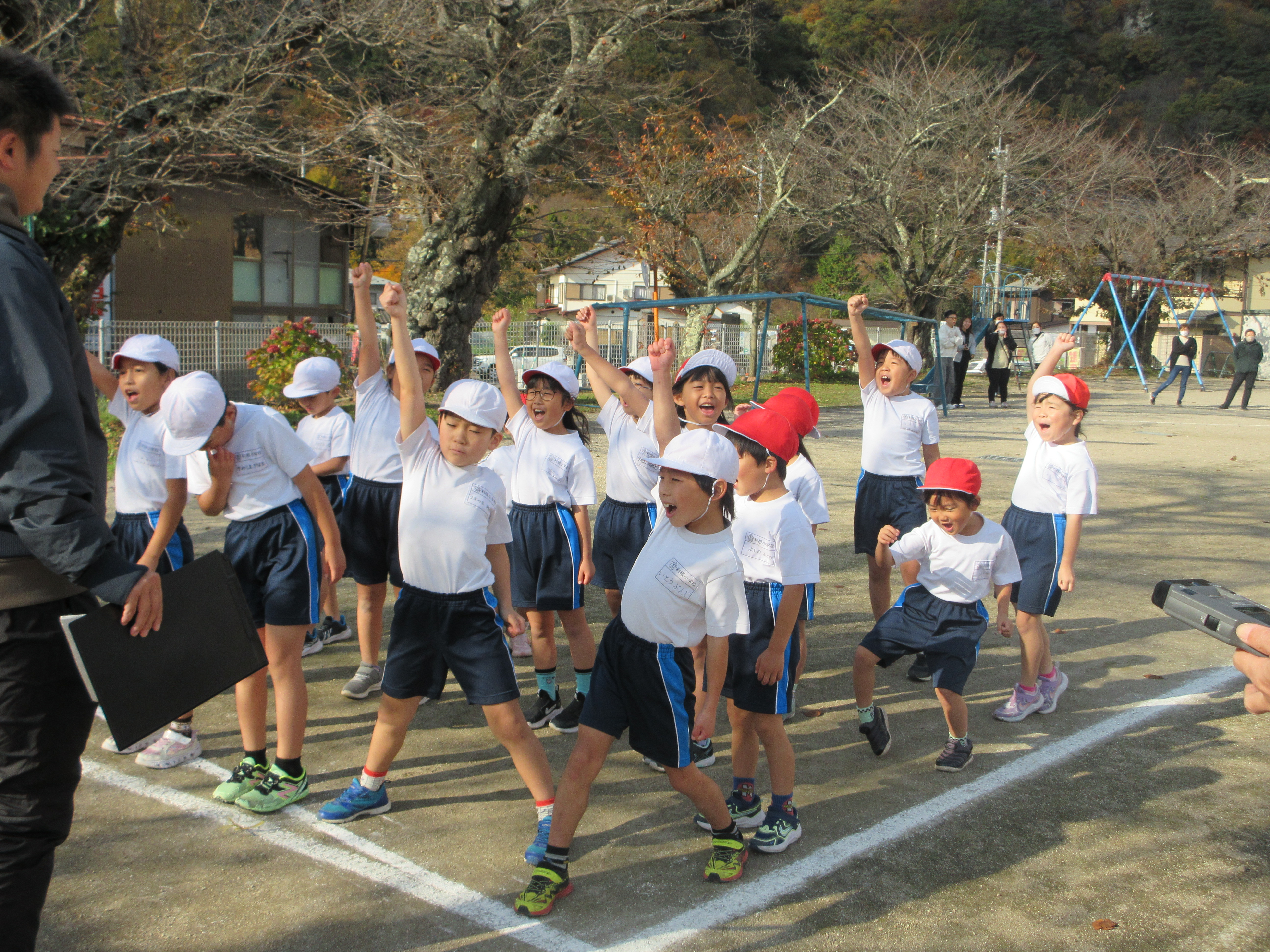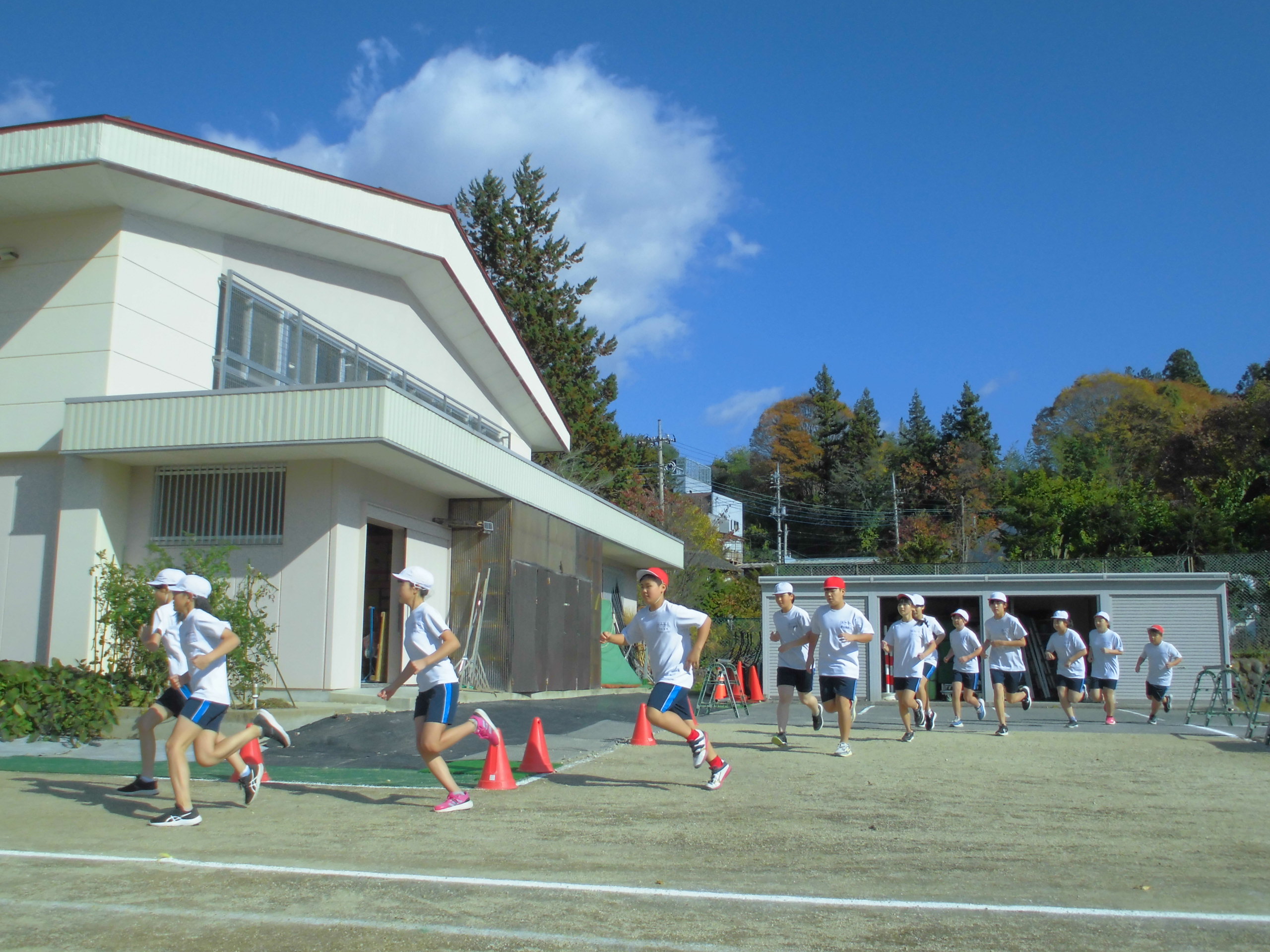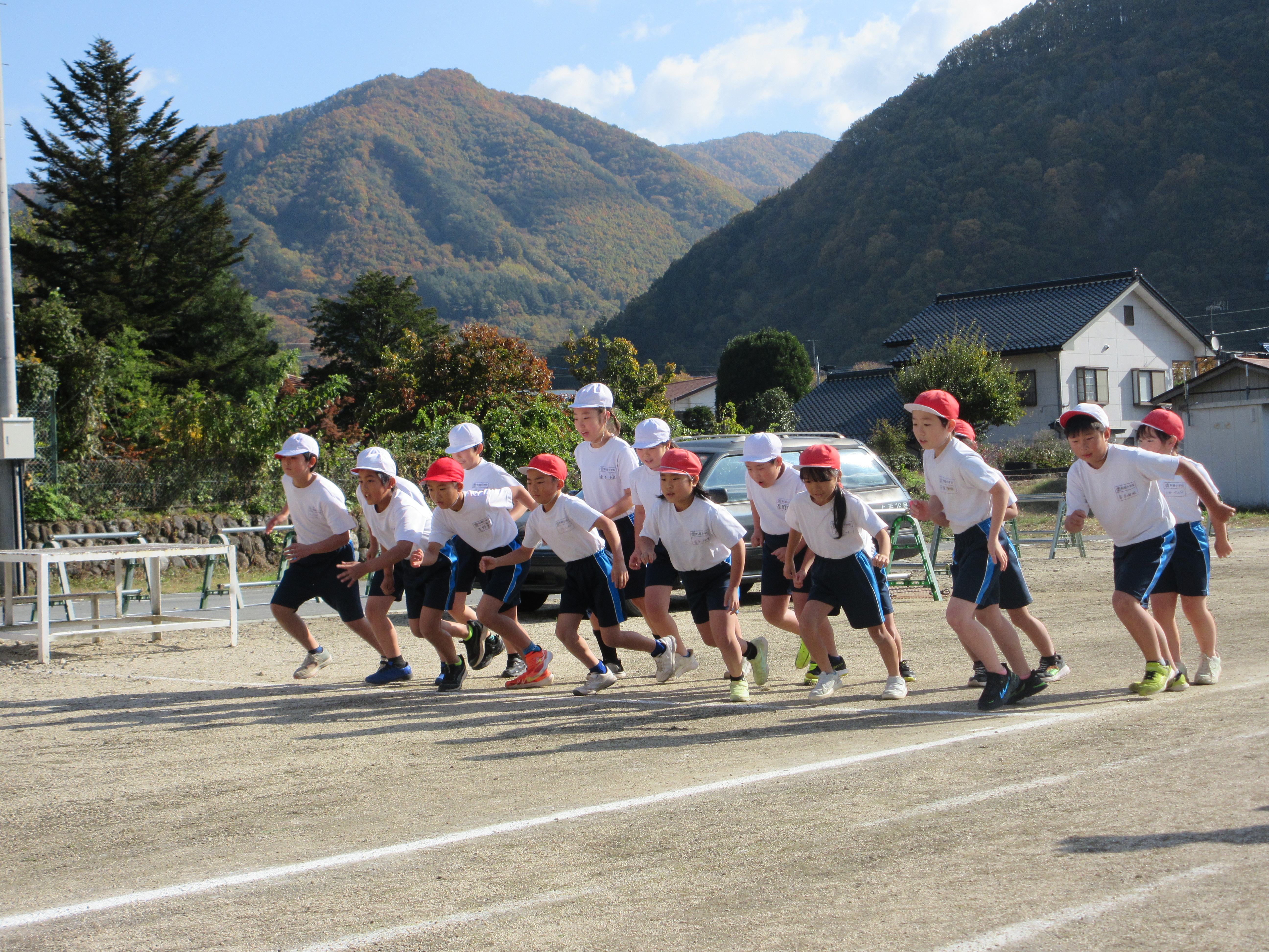 全国で毎日のように熊による人身被害が報道されている中、今年度は児童や保護者・教職員の安全面を考慮し校庭でのマラソン記録会としました。天候はまあまあよかったのですが、ときどき強風が吹き大変でした。例年マラソン大会で走るサイクリングコースとは違いましたが、全員の走る様子が分かったり、みんなで応援ができたりしたのでこれはこれで大成功だと感じています。周りの山々の紅葉に囲まれながら一生懸命走る児童とそれを応援する児童というよい景色が見られました。こうやって1つ1つの行事が子ども達によい思い出となって残ることを期待しています。