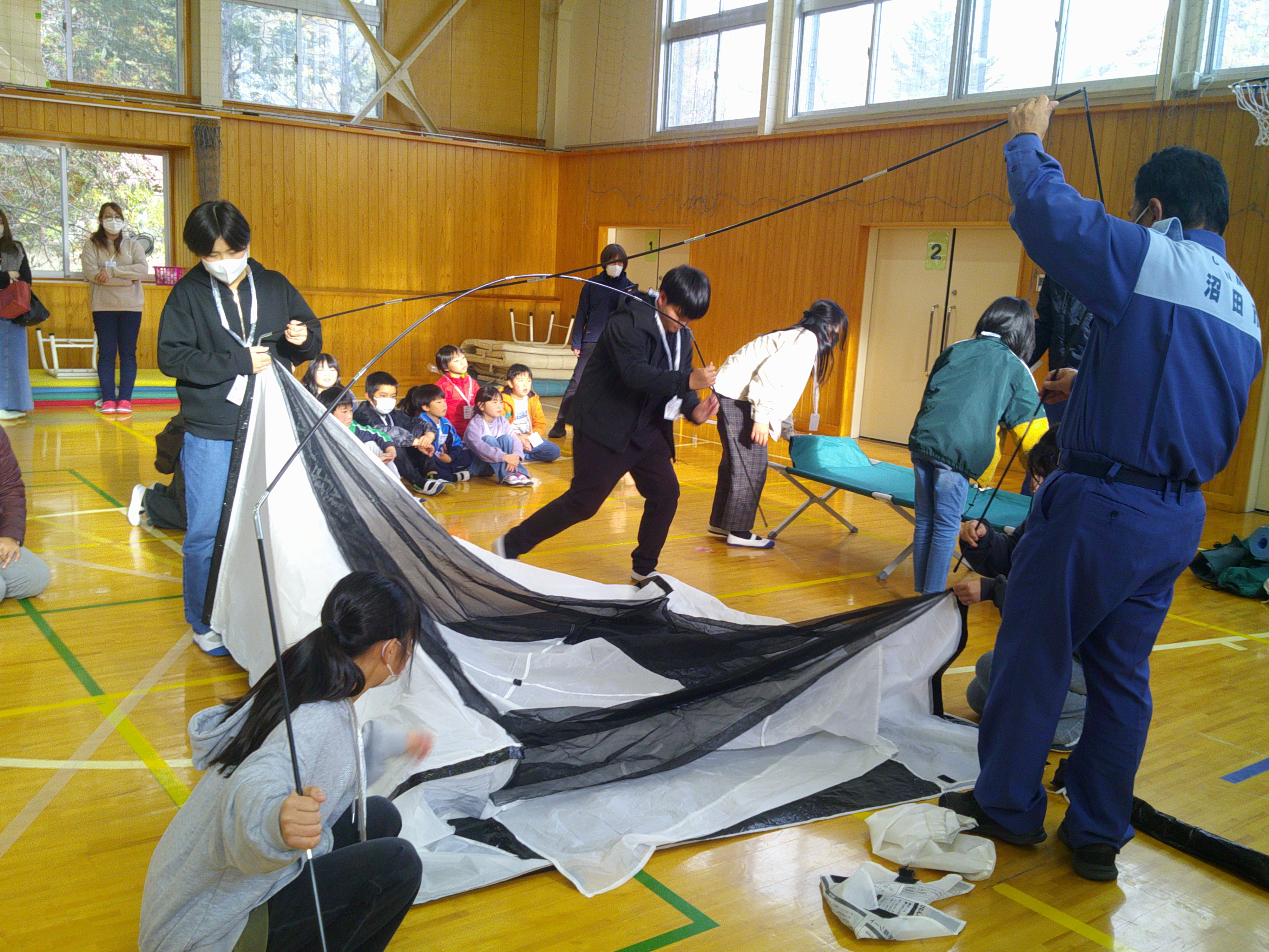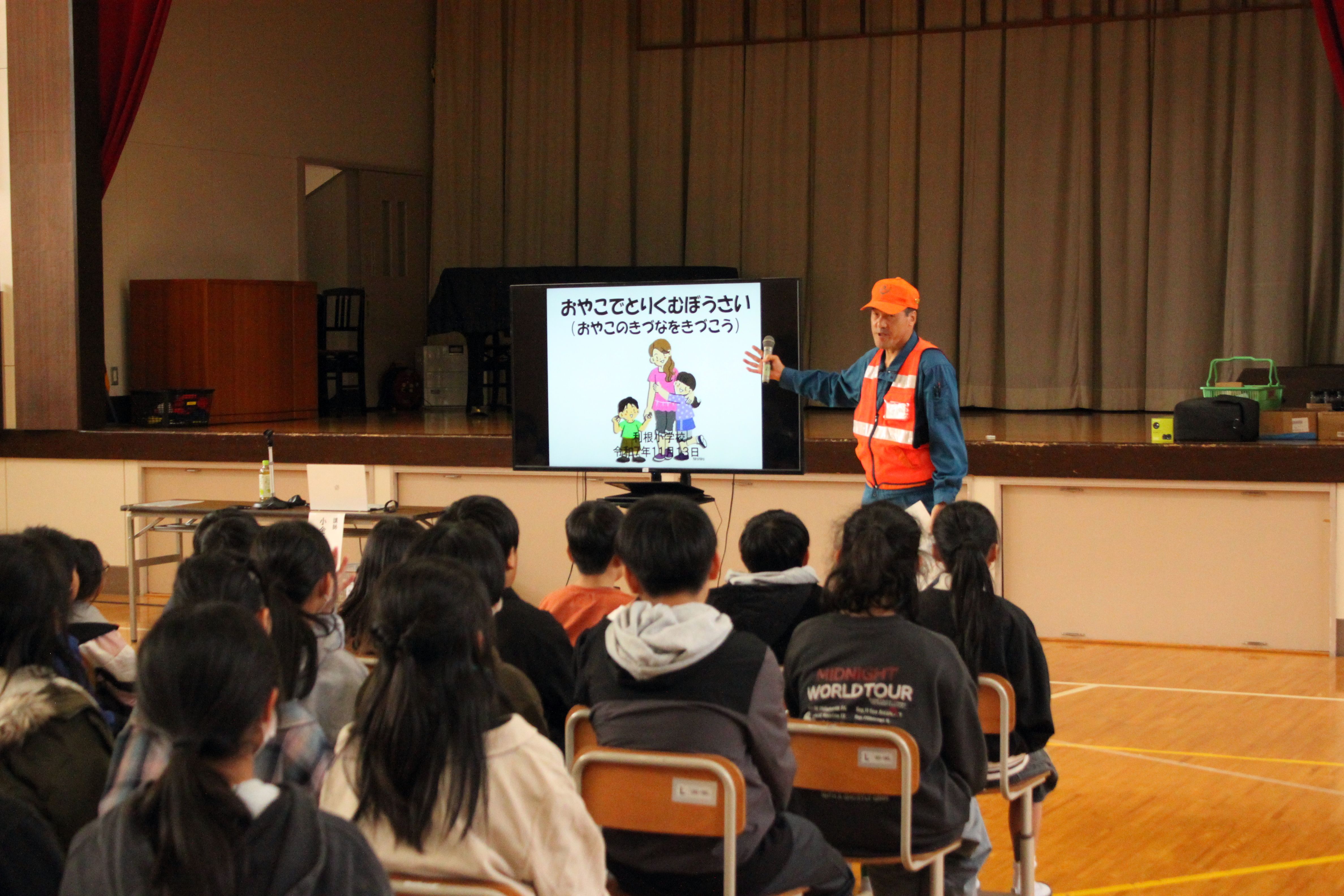 今年はかつて3校の利根町にあった小学校が統合してから10年目となります。その10年の節目を記念して、防災教育に絡めた学校行事を行いました。元自衛官で阪神・淡路大震災や東日本大震災など数多くの災害現場で救助活動に従事した防災アドバイザーの小金澤さんをお招きし命の大切さについてご講演いただきました。その後、防災〇×クイズを経て起震車体験、避難所設営、非常食試食など様々な関係機関のご支援とご協力をいただき、大変貴重な体験を得ることができました。自分の命は自分で守るという「自助の意識」と災害を想定した「事前の備え」が大切であることが児童に少しでも残れば大成功だと思っています。