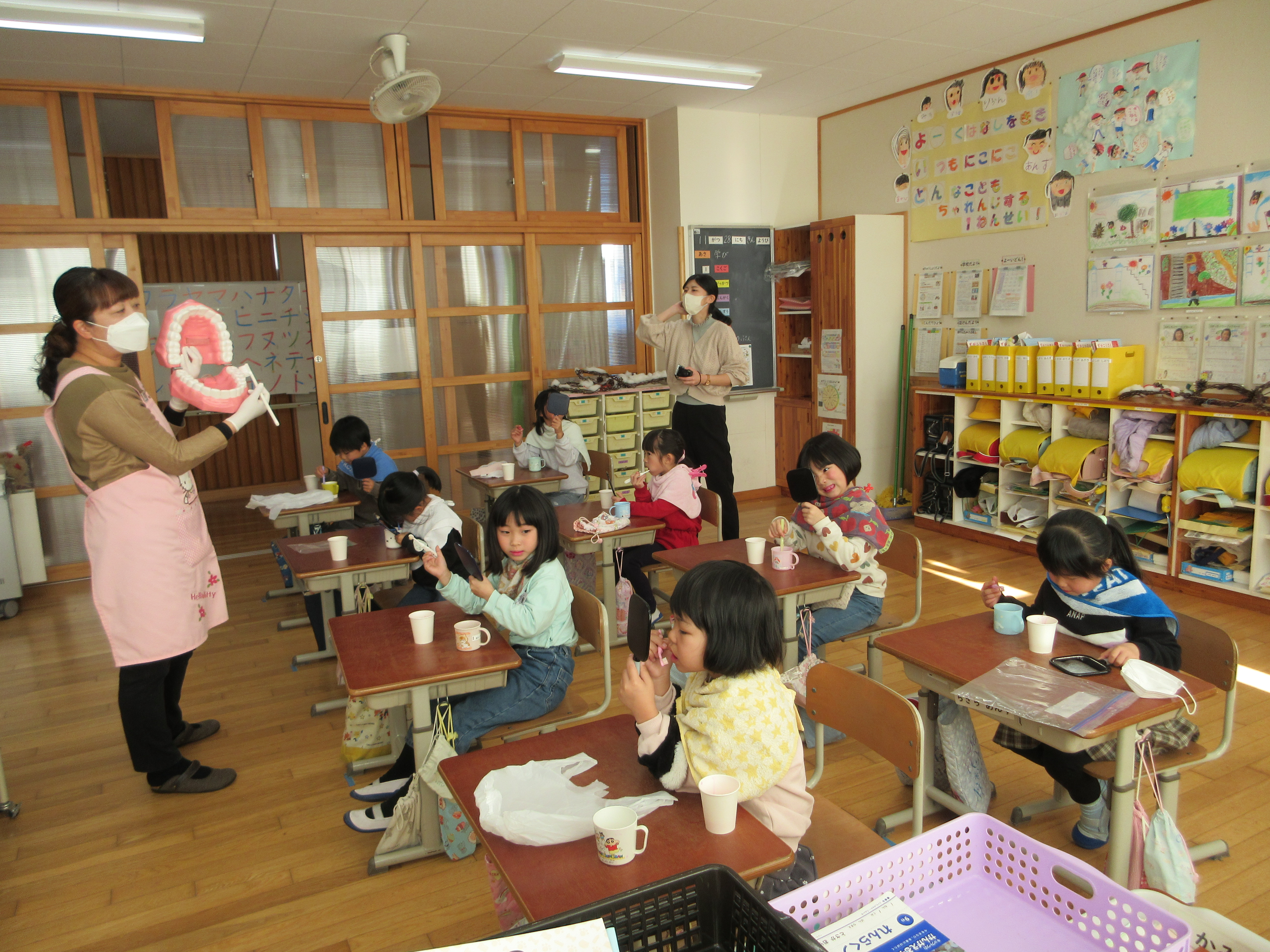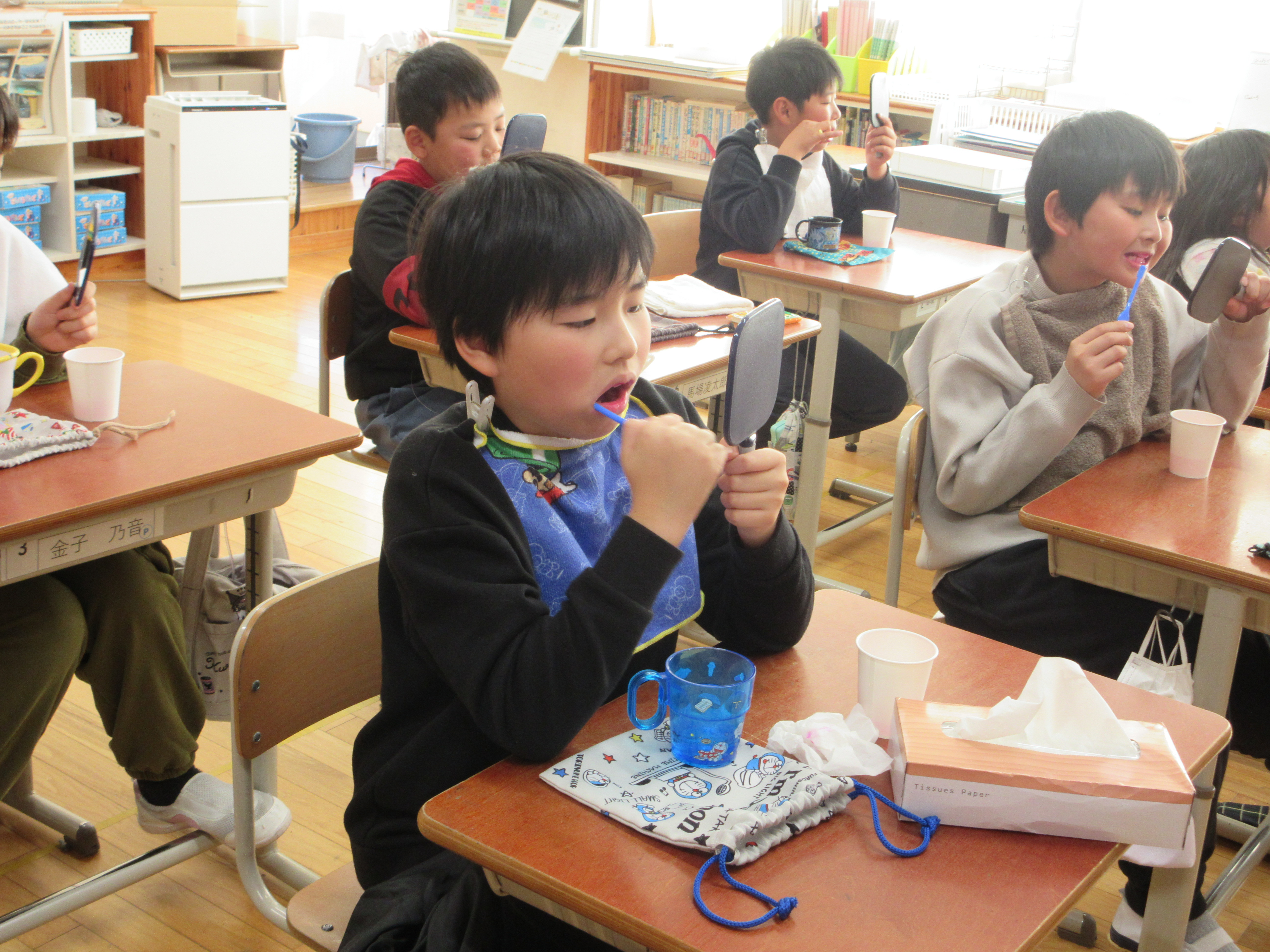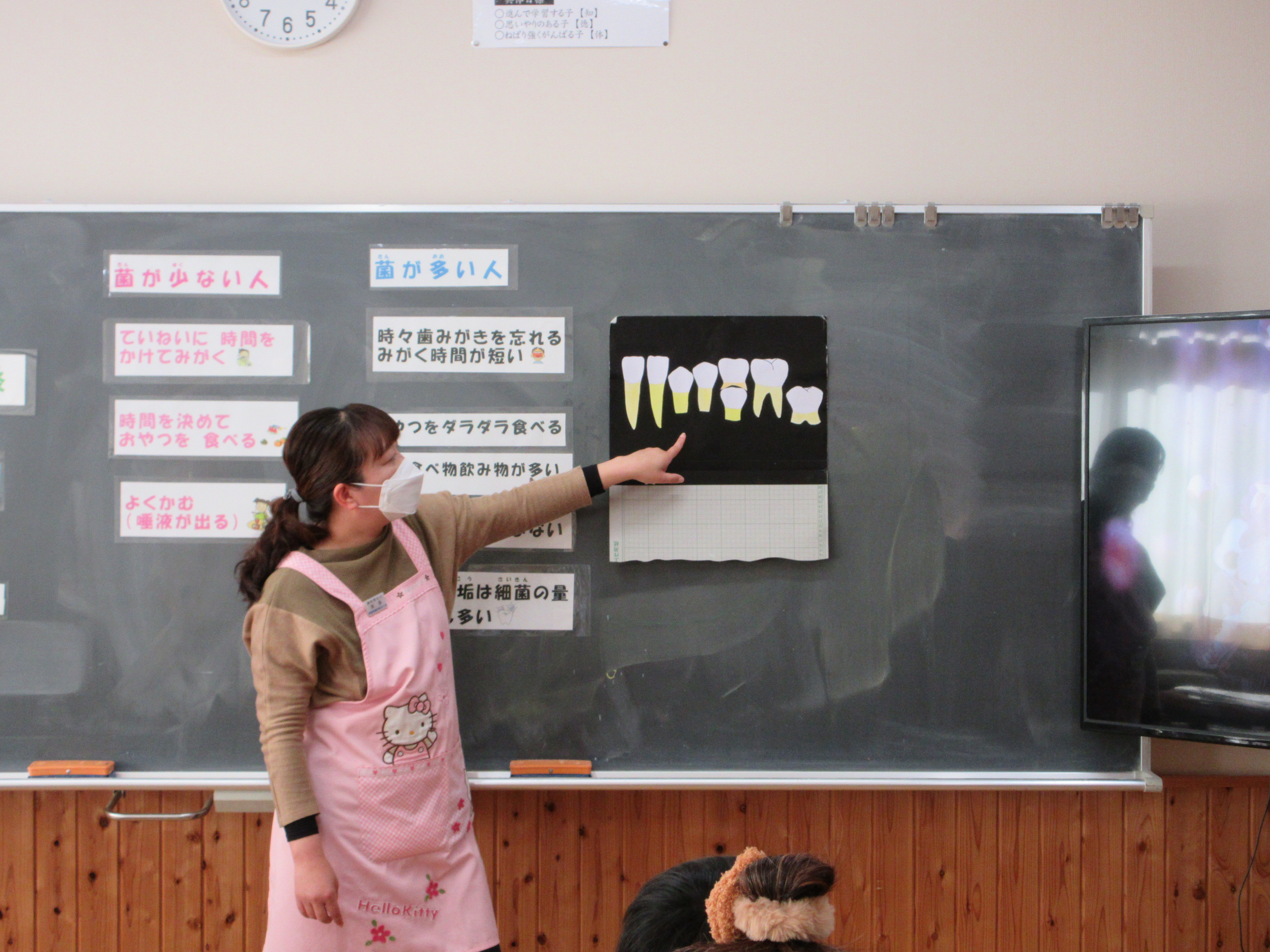 今日は歯科衛生士の本多先生をお招きして、1年生と4年生がむし歯予防や正しい歯磨きの方法等について学習しました。普段通りの歯磨きだとたくさんの磨き残しがあることに気がついた児童が多く見られました。歯は一生の宝物ですので、虫歯で失うことのないよう大切にしていきましょう。また虫歯のある人は歯磨きでは決して治りませんので、早めに歯医者で治療しておきましょう。