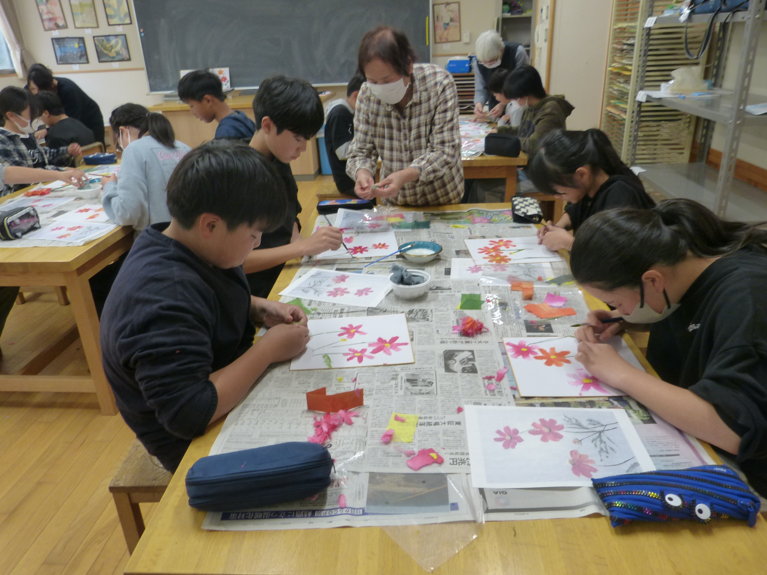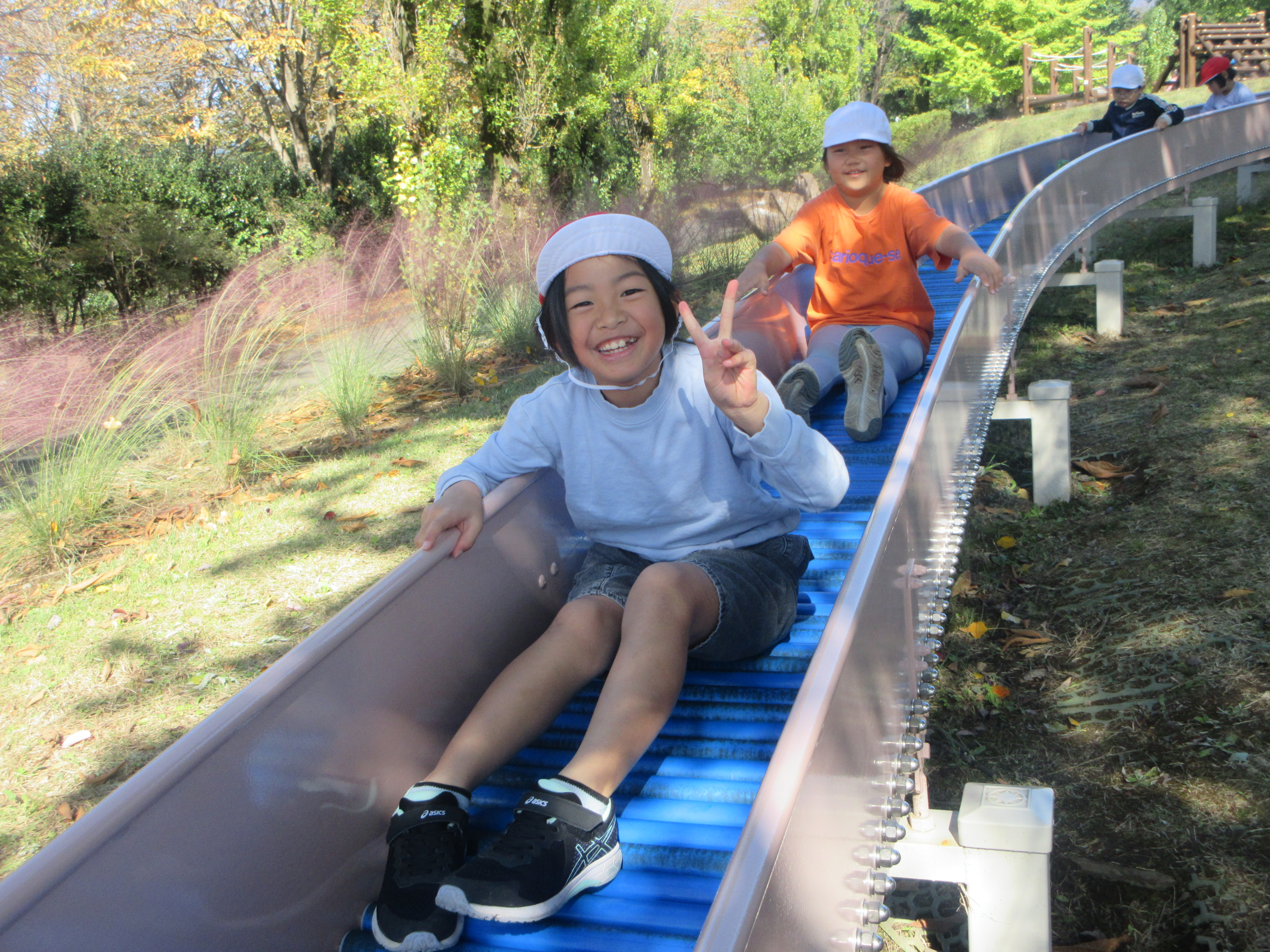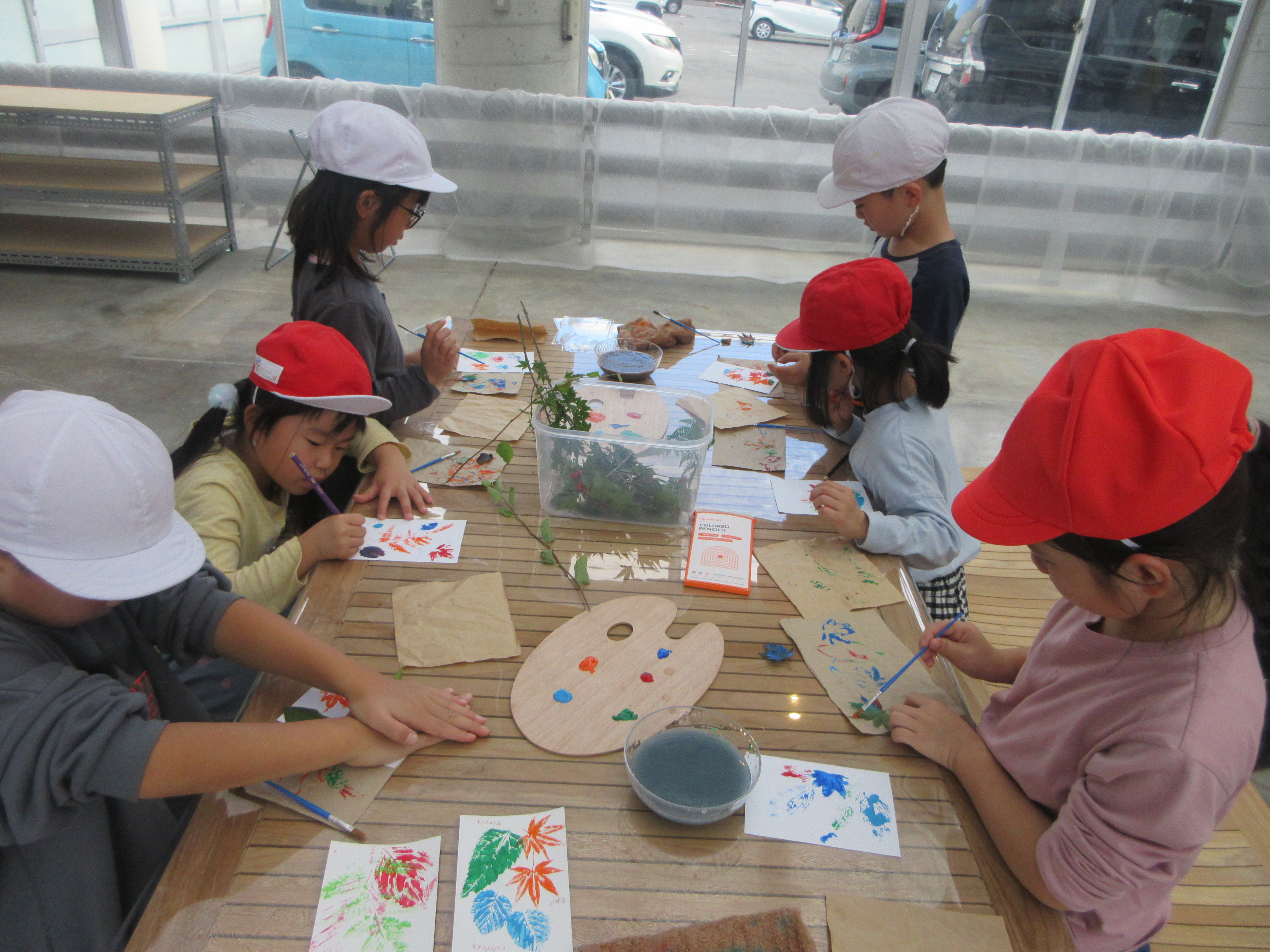 1年生は秋の旅行でフラワーパークに行ってきました。班行動では、プレイガーデンの遊具でみんな楽しそうに遊んでいました。おいしいお弁当を食べた後は、葉脈のスタンプで思い思いの色や葉を使って、世界で一枚だけのはがきを作りました。
