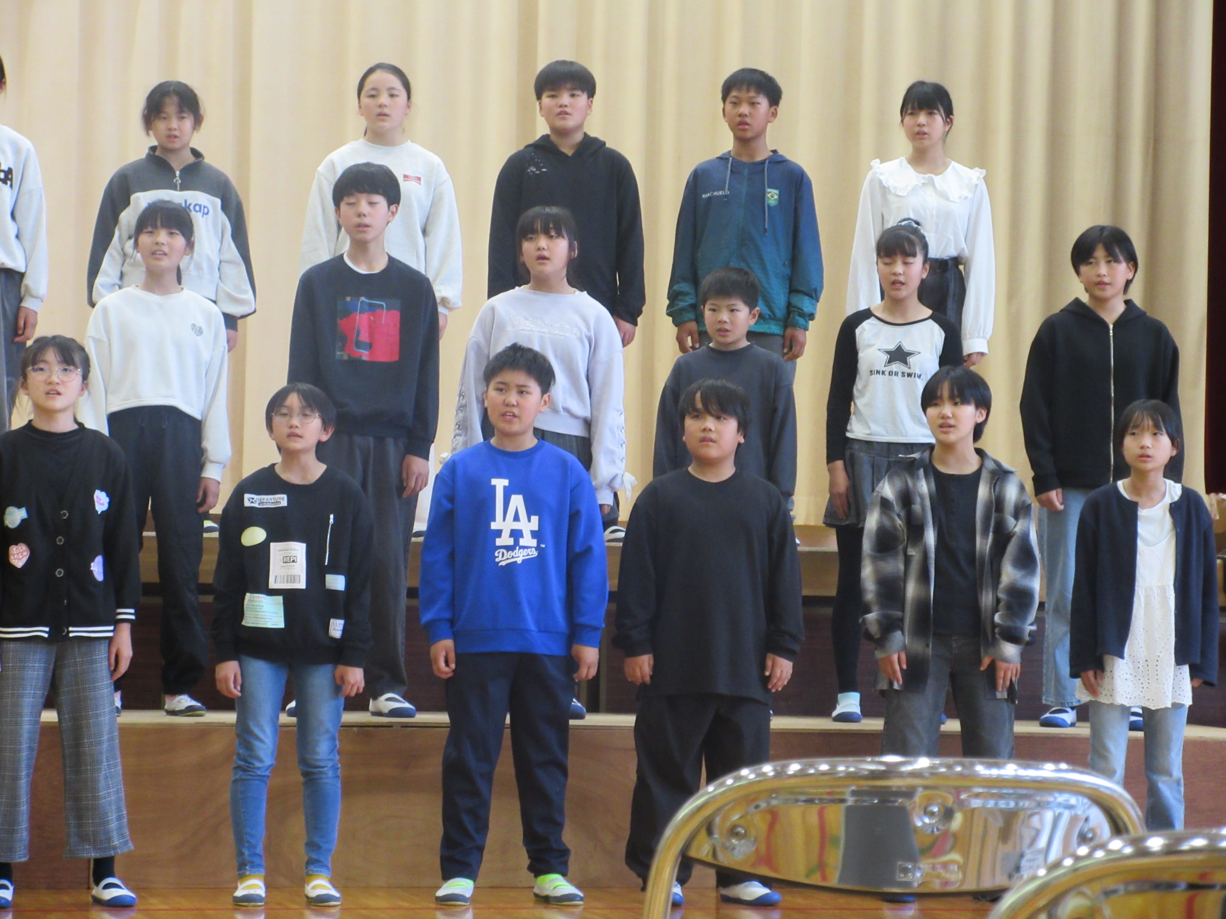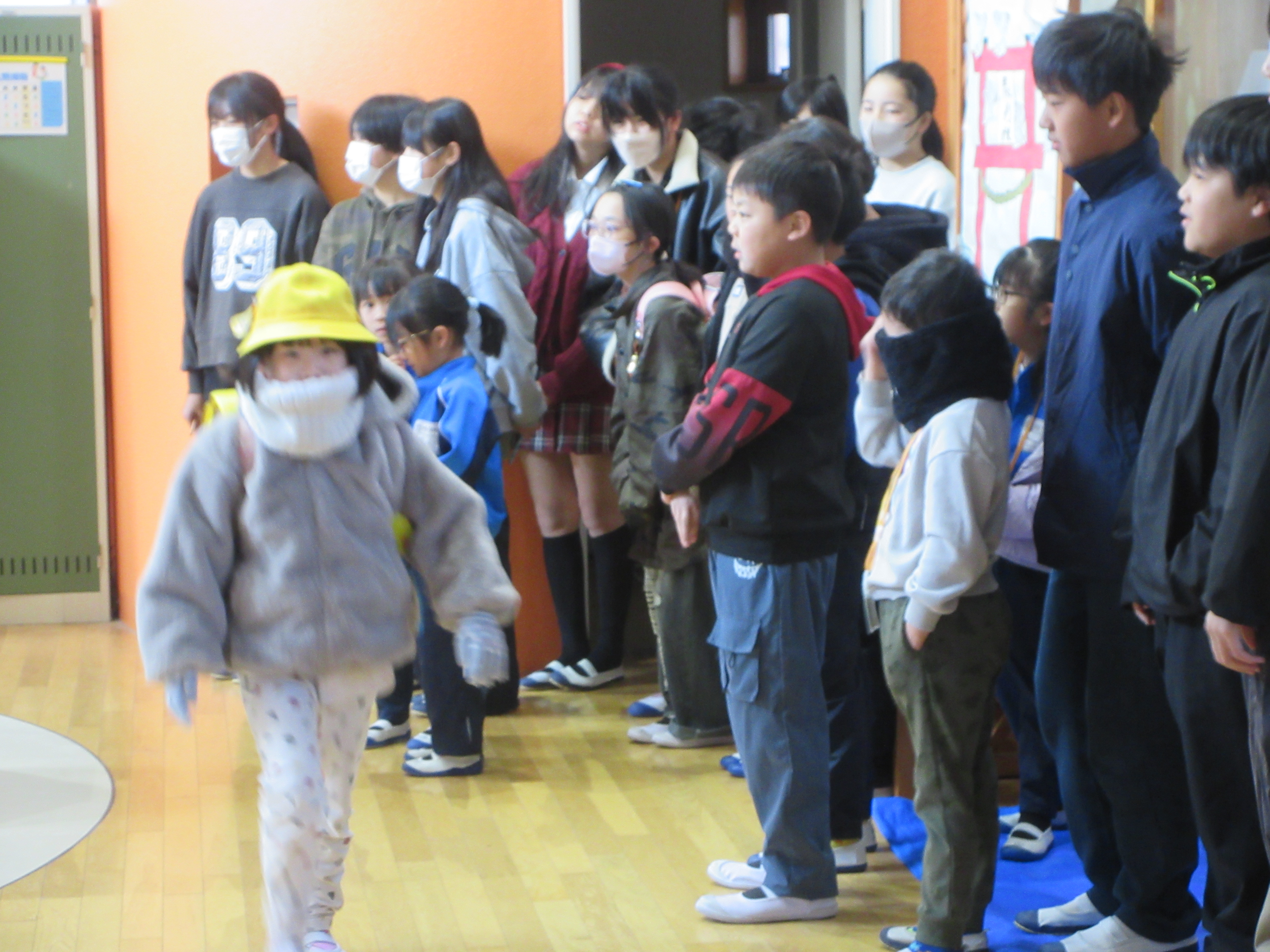 先週のことですが校長室にいると、1年の教室から何やら大きな声が聞こえてきます。「うんとこしょ どっこいしょ まだまだかぶは ぬけません」どうやら国語の音読発表会に向けて1年生達が一生懸命練習をしていたのです。今日はその発表会の日でした。6年生達と手の空いている教職員で発表会に参加しました。おじいさんや猫などの役になりきって張り切る1年生の様子を見て、微笑ましくなんともいえない温かい気持ちになりました。その後6年生は全員がそれぞれの観点で感想を述べていてこれもまた立派でした。