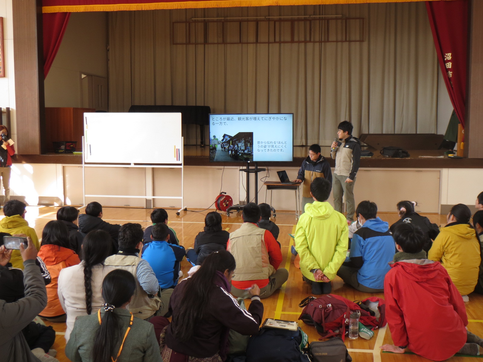 毎年この時期は、尾瀬高の自然環境科の生徒さん達が4年生の児童を吹割の滝に連れていきあまり知られていない歴史や動植物などを詳しくガイドしてくれます。 今年はインドから視察に来た団体(教員)も一緒になって吹き割りの滝を散策しました。体育館では、児童も事前に個々で調べたことを発表し、たいへんよい経験となりました。