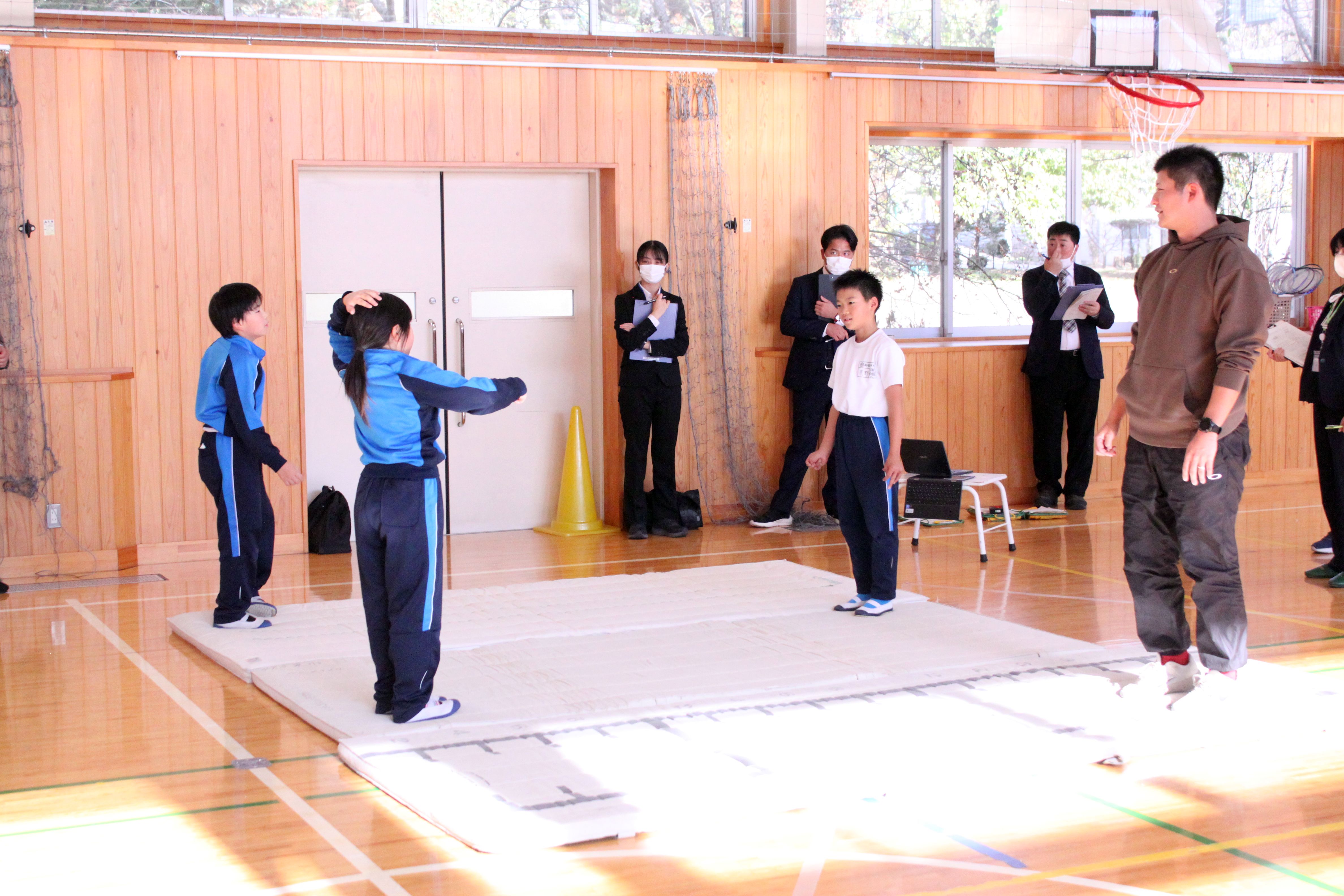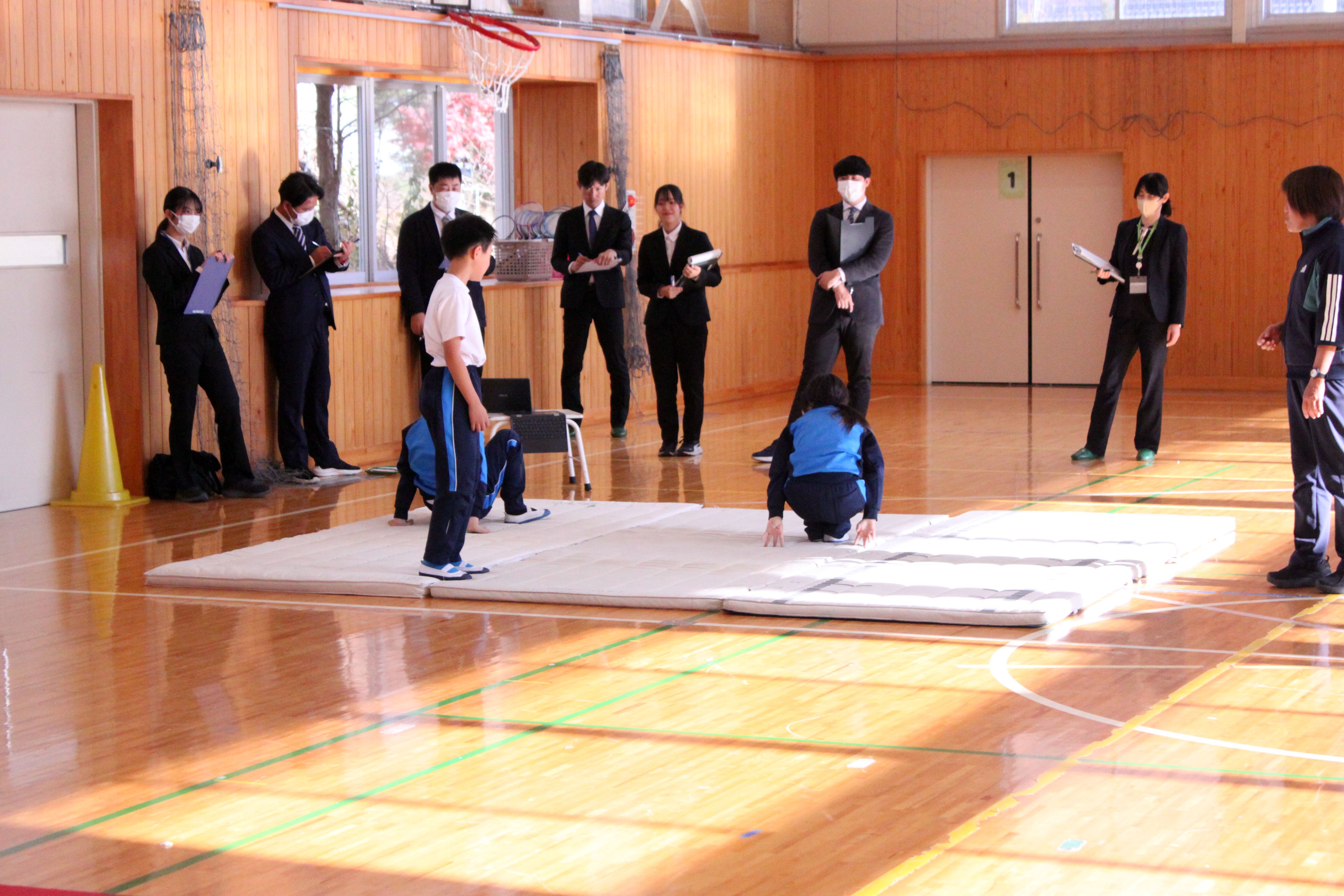 今年度は本校が市の教育水準の当番校であり、代表授業として3・4年生のマット運動を公開しました。本時のめあては「自分や仲間に合った技や組み合わせ、動きを考えて、伝え合おう」です。児童は4名の各グループに分かれて 、自分達ができる技の確認や動きのパターン、動きを合わせる工夫などがよく話し合われていていました。全員が楽しそうにマット運動の技に取り組めていたので、このような授業をとおして、児童一人一人がより確かな技の習得に繋がっていくとよいと考えます。