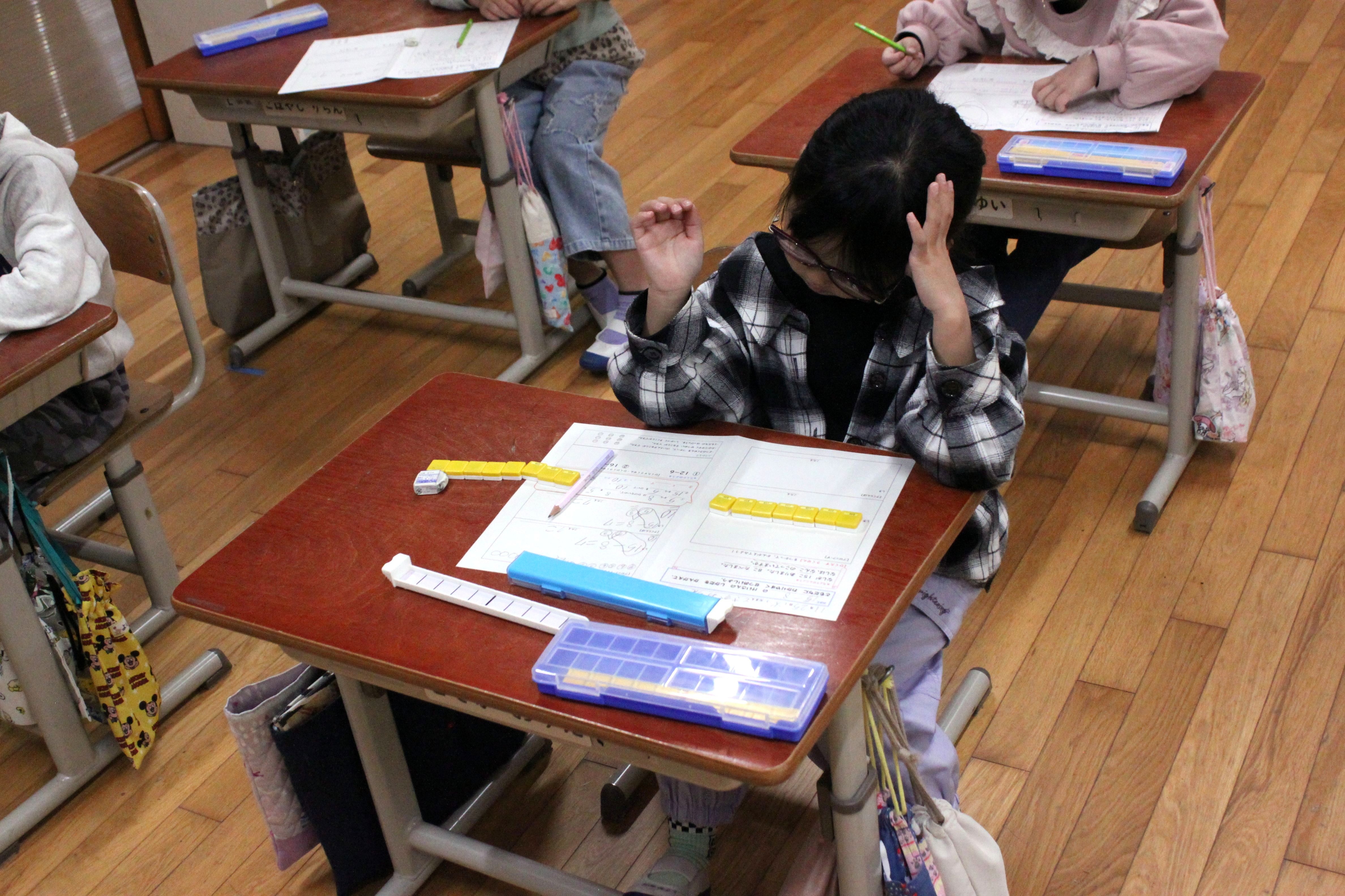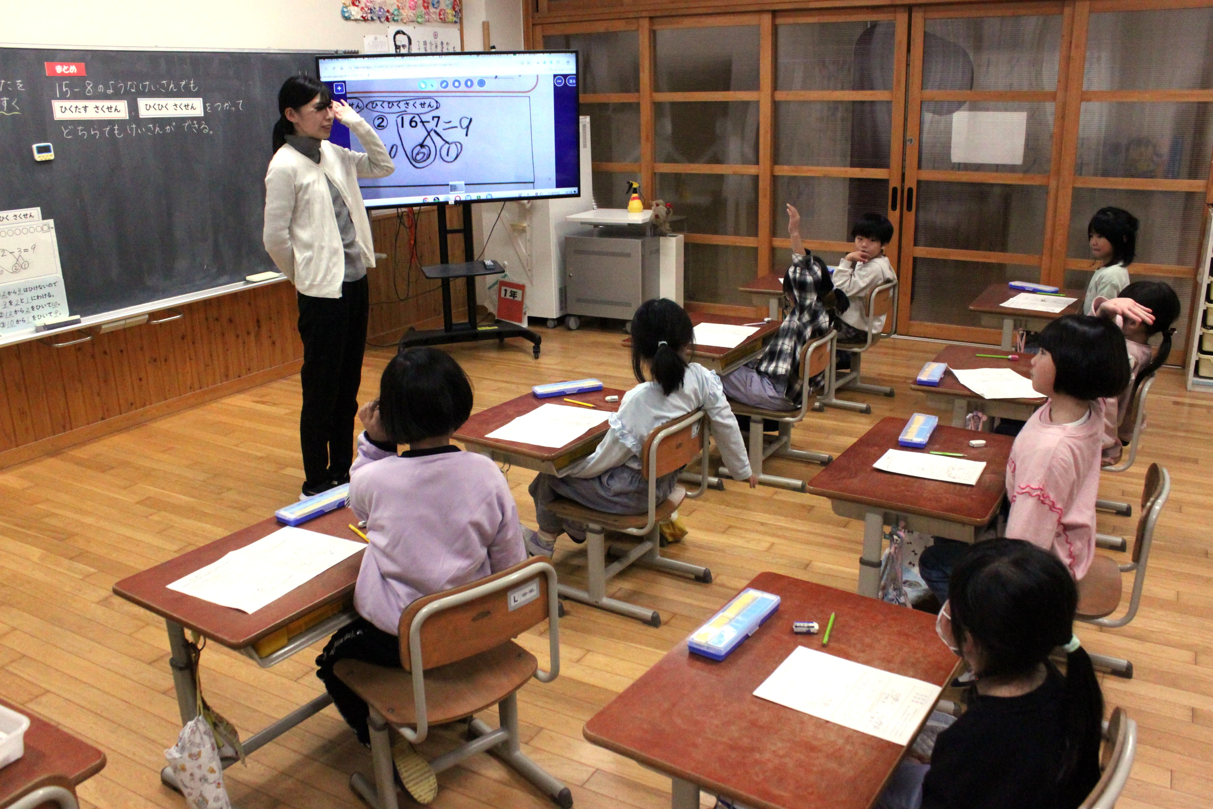 4校時に1年教室で研究授業が行われました。本時のねらいは「15−8の計算の仕方を考え説明する活動を通して、自分の考えを図や式、言葉を用いて分かりやすく表現し伝え合い、減加法と減減法のどちらを用いても計算できることに気付くことができる」です。10から8を引いて2、5と2を足して答えは7といった減加法を使う児童が多かったです。1年生の算数で、繰り下がりのある計算は、つまずきが多く見られるところです。確実に計算ができ説明できるよう学習していきます。