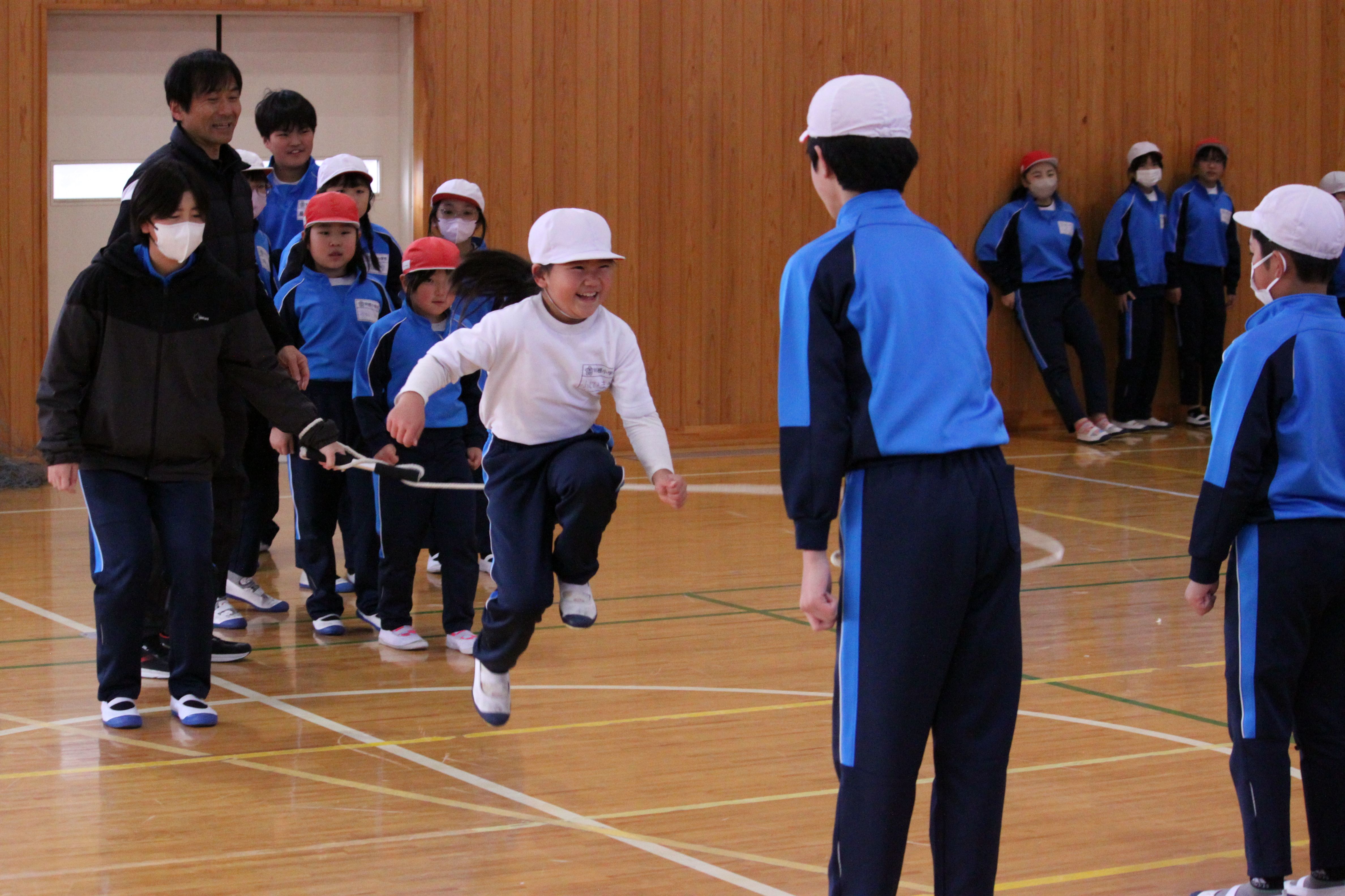 今朝の集会は体育館で長縄の練習です。 2月のアスリートカップでは、各団の回数を競います。長縄では、入るタイミングが分からない、跳ぶ場所がよくないため縄に引っかかるなどの課題が挙げられるかと思いますが、わずか15分程度の時間でどんどん上達していく低学年の姿に驚きです。また跳べるコツを優しく教え、励ましてくれる上級生が立派ですね。
