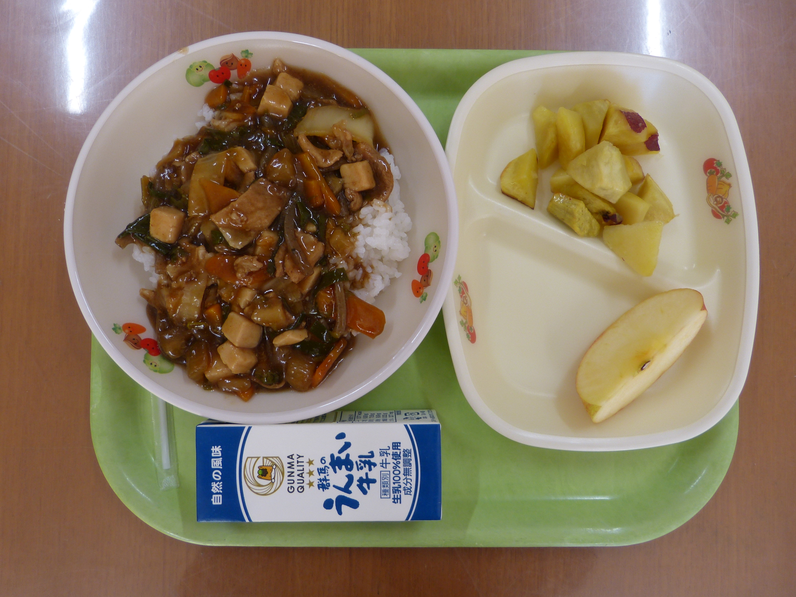 今日の給食のメニューは、マーボー野菜丼、サツマイモのバター風味焼き、りんごです。サツマイモが甘くておいしかったです。ちなみにサツマイモの原産地はメキシコを中心とする中央アメリカといわれ、日本では薩摩(鹿児島県)から伝わったことから「さつまいも 」と呼ばれるようになりました。