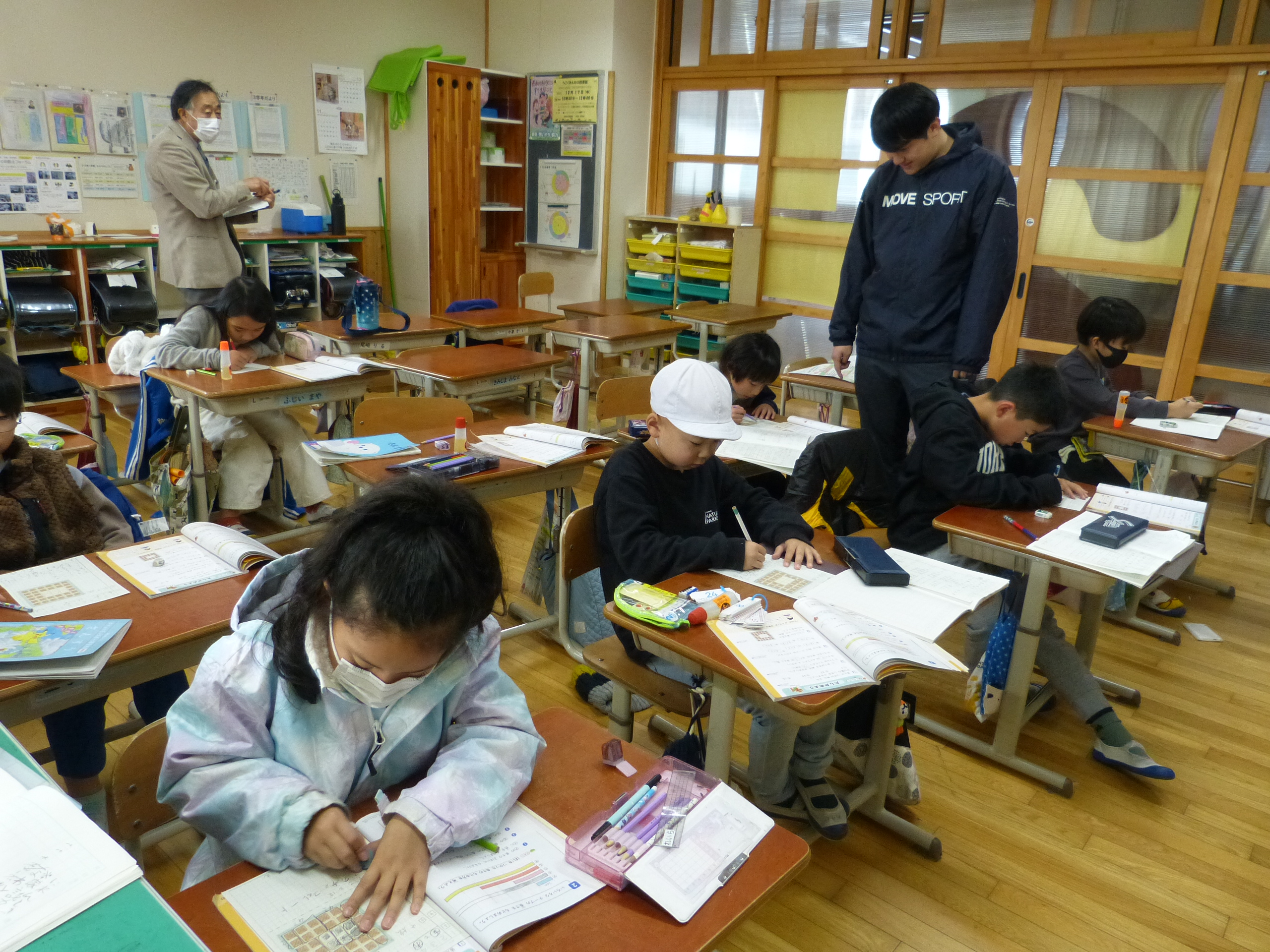 3校時の授業風景です。校庭では5・6年生がソフトボール投げの記録を測定しています。45°だよと周りから声援が聞こえてきます。教室では2年生が25−12という計算を学習しています。すでに頭の中で計算できる児童も何人かいましたが、筆算の仕方をしっかりと理解し、最終的に桁数が増えた繰り下がりのある引き算を習得していけるとよいですね。